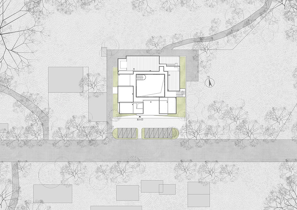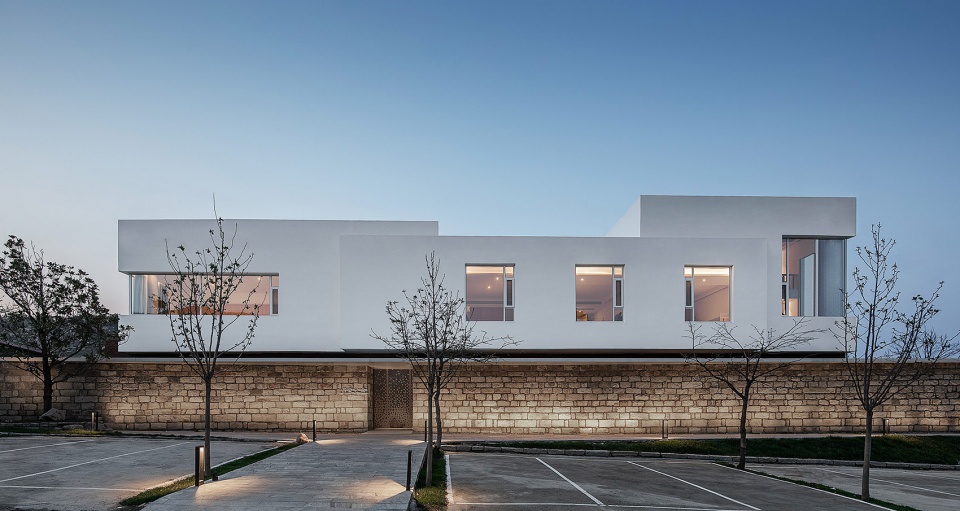 建筑沿街外立面上略低于二层层高线上的一条明确的水平分割线将建筑体量分为上下两个部分。分割线以上为表达“轻”的白色体量,其以下则是没有开窗,仅设一个出入口的连续长墙。墙面质感粗糙,颜色暗淡,与上方白色的建筑体量对比形成了视角感受上的“重”。这条水平分割线也是对外部场地沿道路细微落差的回应,以修正入口广场因为高差在视觉上带来的偏差。