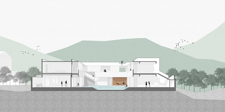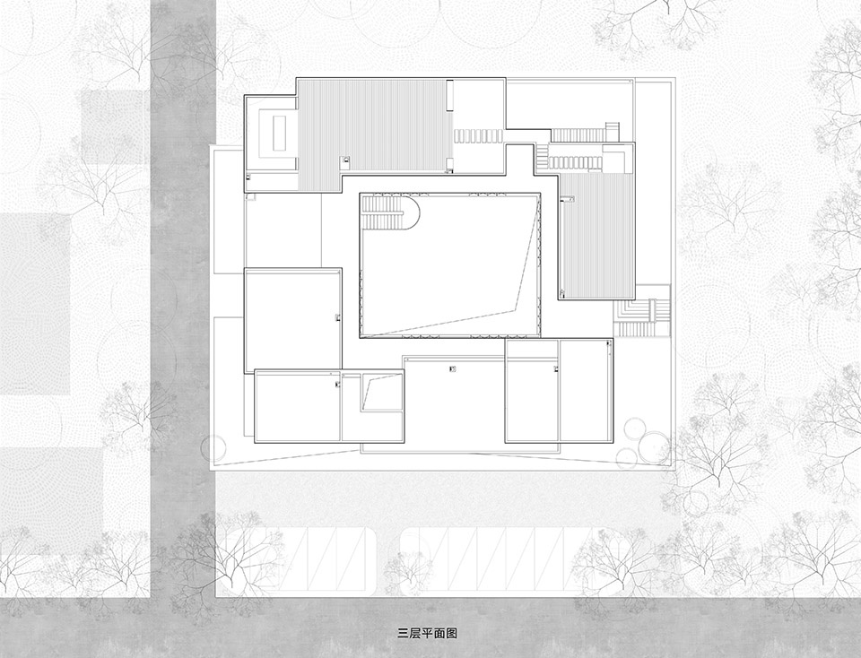 在建筑中,内院式的布局形成沿内圈行走的捷径,而沿着东南西北各向的开口及开口内部通向各个标高的楼梯则延展了路径的维度,并最终形成场地内通达而可无目的漫游的路径。交通流线连接了多个位于不同标高的空间,包括位于院落中央的水池区、入口上方的天井回廊、建筑东侧的休息平台,北侧的户外餐厅,以及屋顶上高低错落的观景露台。这是一系列串接在无预设路径上的空间,希望使用者在体验中逐渐发现。