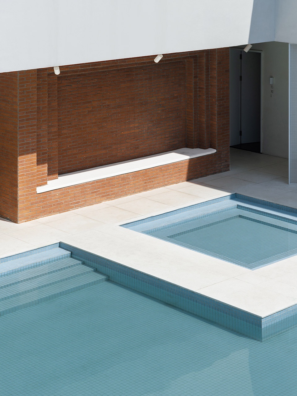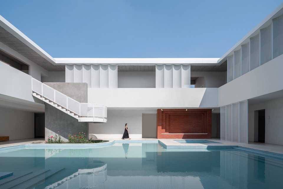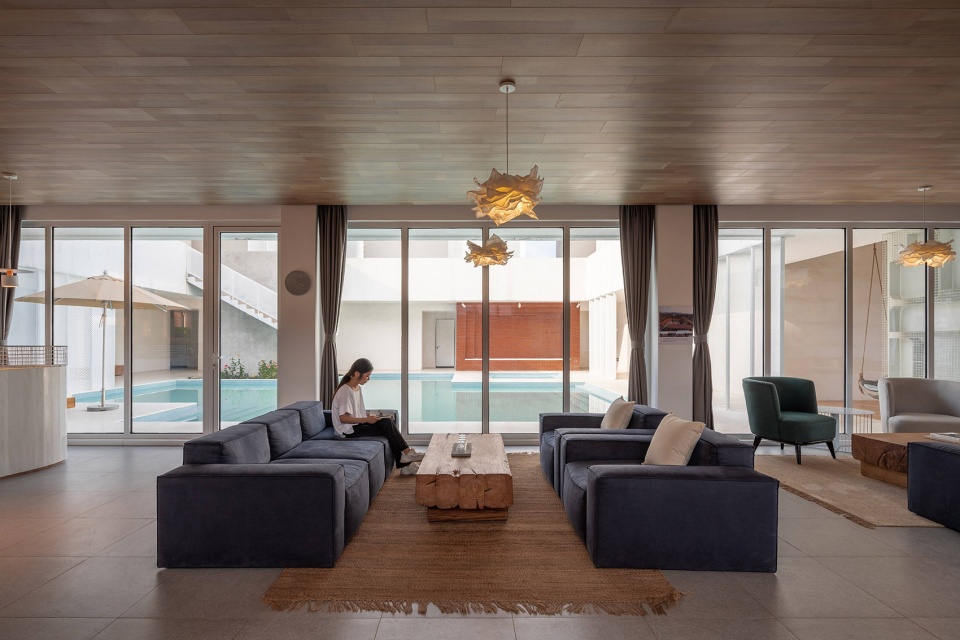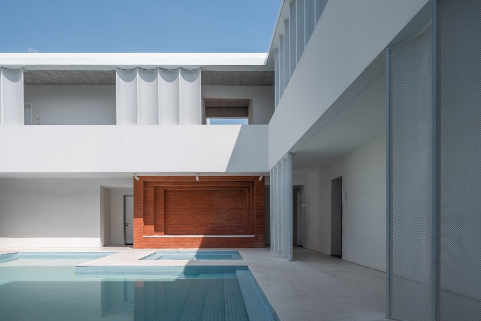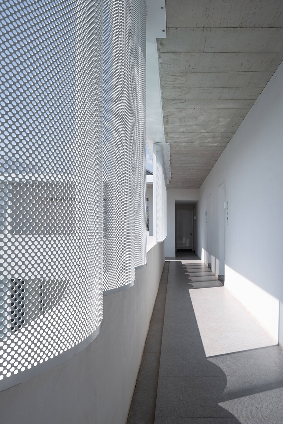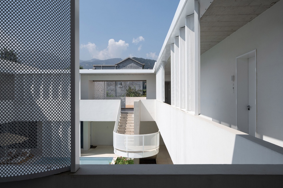 内庭院、楼梯等连续可感知的交通流线上,设计以细密的弧形穿孔铝板形成了院落中如“云”一样轻的质感,而院落中浅蓝色的水池反射的天光进一步增强了这个意象。随机设置的弧形穿孔铝板遮挡部分公共空间及客房入口,用以模糊内院边界。