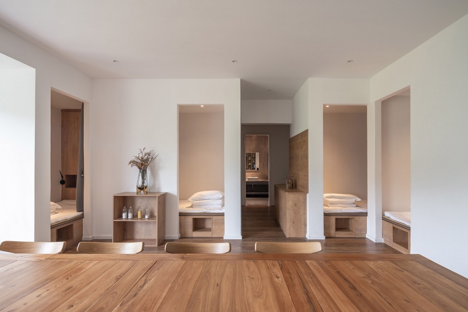 室内设计也延续这个意象,公区餐厅设置云朵吊灯,吊灯上方设置弧形钢丝网格、客房区也以钢丝网构架作为家具的主要构型。室内除了原木色、白色之外,局部点缀克莱因蓝,用以拓展“云”这个意象的边界。