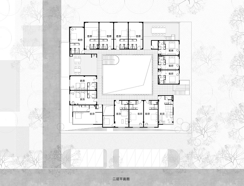 从村落肌理及场地分析得到的平面矩形建筑外轮廓形成了规整的外部界面,进而推得规整的内部边界。但在空间关系上,设计通过打断边界以及面对不同朝向的不同剖面关系的处理,将原有规整边界消解,最终形成模糊的空间边界。此边界的模糊地带为空间多样性提供了更多可能。