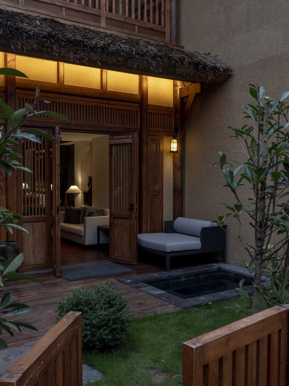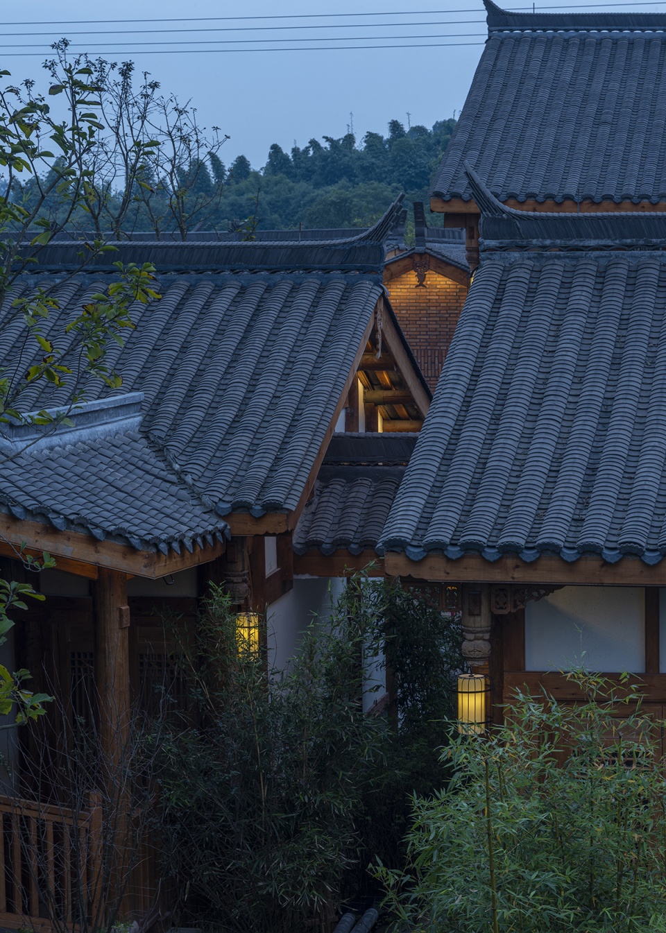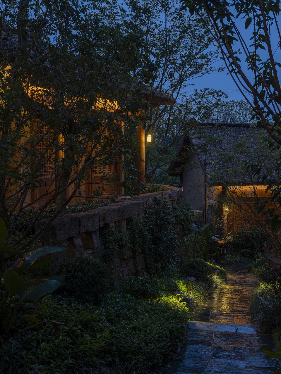 客房,夯土墙、茅草顶、木梁架,酒店建筑的川西民居特征清晰。为了与之呼应,室内减少使用人工光线,让亮度降低。不过,考虑现代人长期都市生活的习惯,设计师还是借助装饰灯和间接照明,丰富空间层次,给客人一个自在的状态去细细体味川西风情。