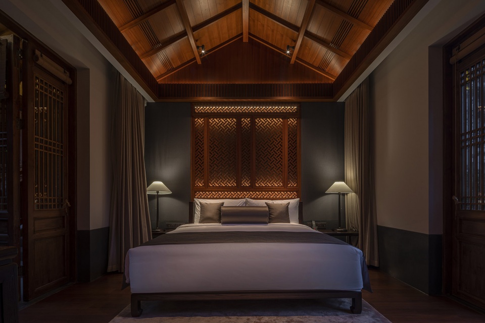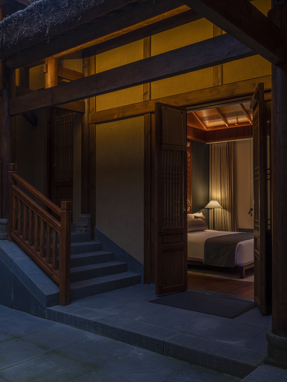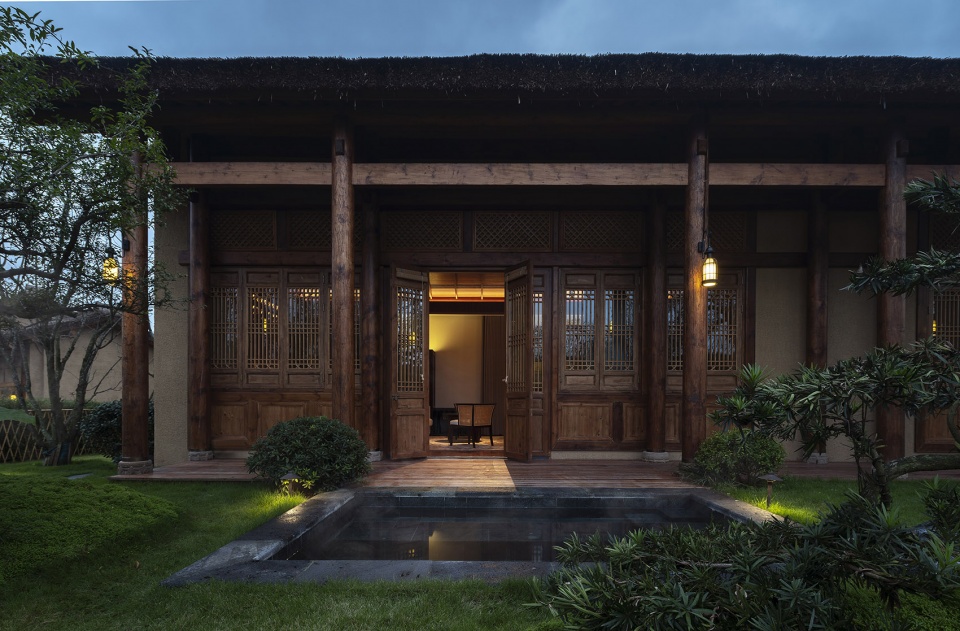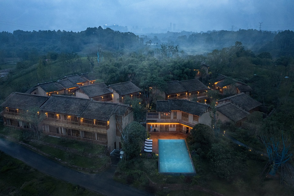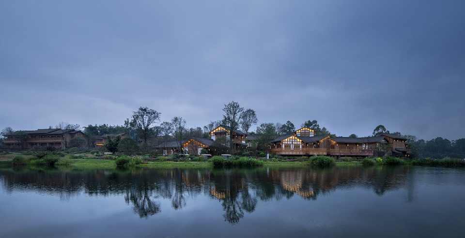 客房,夯土墙、茅草顶、木梁架,酒店建筑的川西民居特征清晰。为了与之呼应,室内减少使用人工光线,让亮度降低。不过,考虑现代人长期都市生活的习惯,设计师还是借助装饰灯和间接照明,丰富空间层次,给客人一个自在的状态去细细体味川西风情。