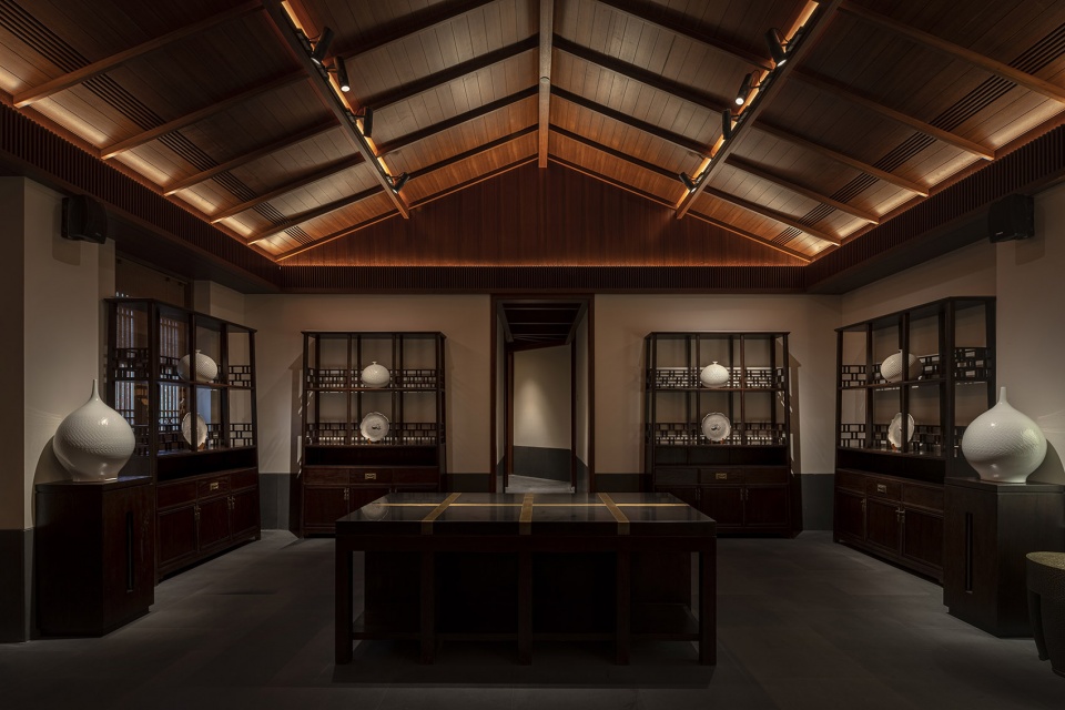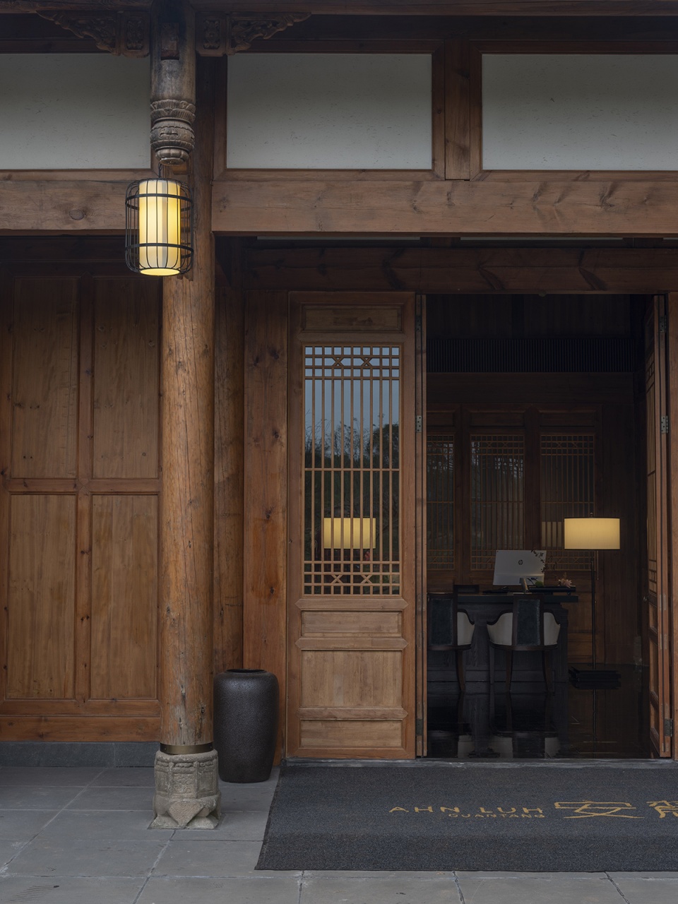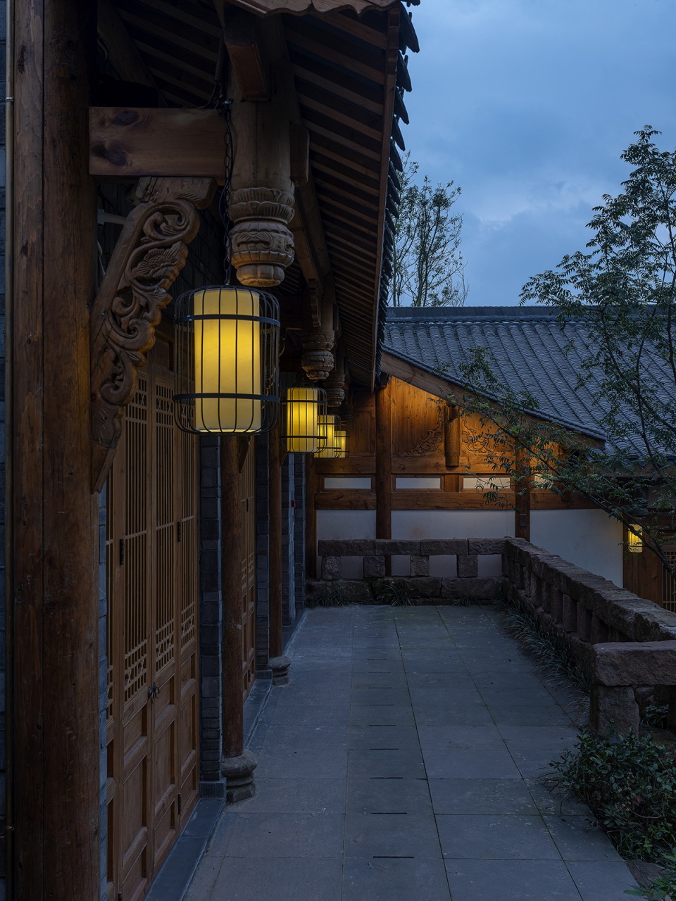 酒店大堂琳琅满目、层次分明,流动光线之下,石雕柱墩的精巧与梁架的朴素互为映衬,川西的 “粗”与“细”一并呈现。