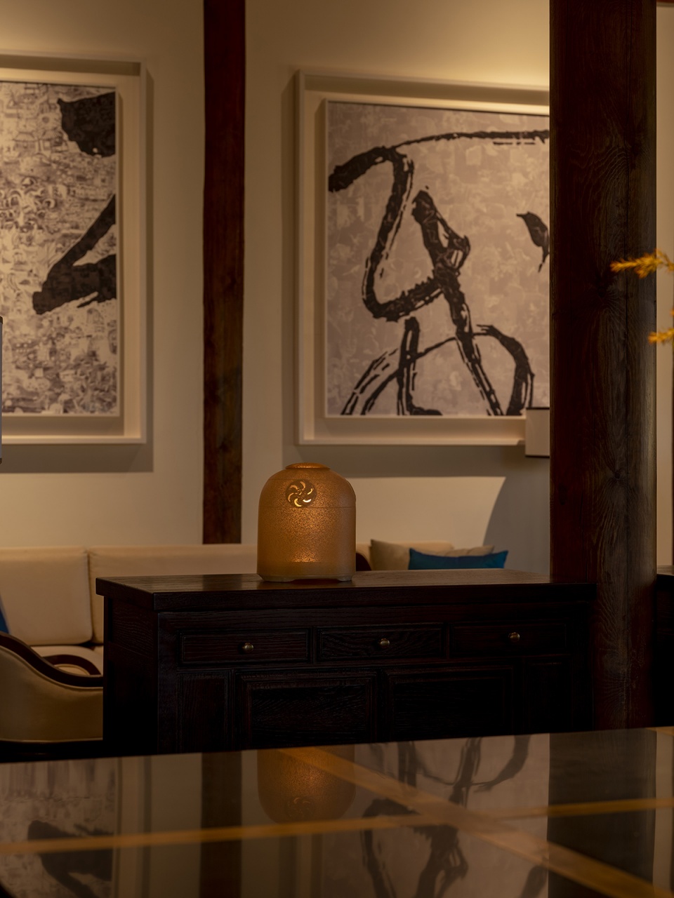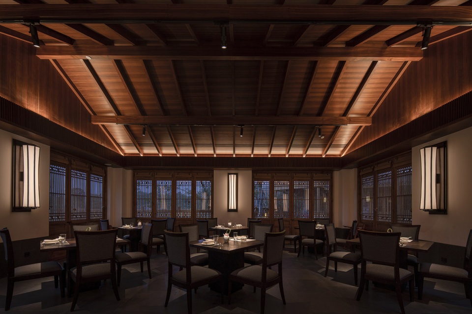 全日餐吧尽数还原旧时川西宅第的用餐场景:空间开敞,桌椅井然。点亮墙壁灯笼后,温润的光线弥漫满屋,似乎要将所有人融于一起。精心设置的光线经过细心强调,又将每桌私属的空间感剥离开来。