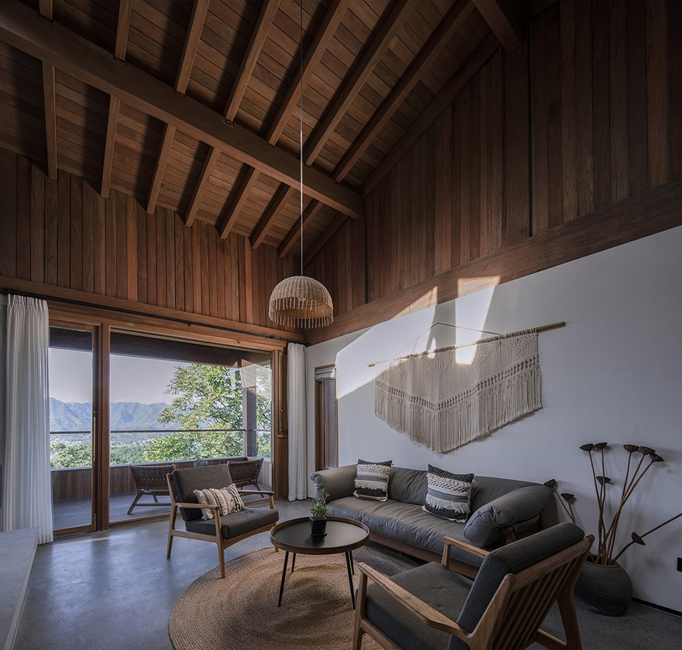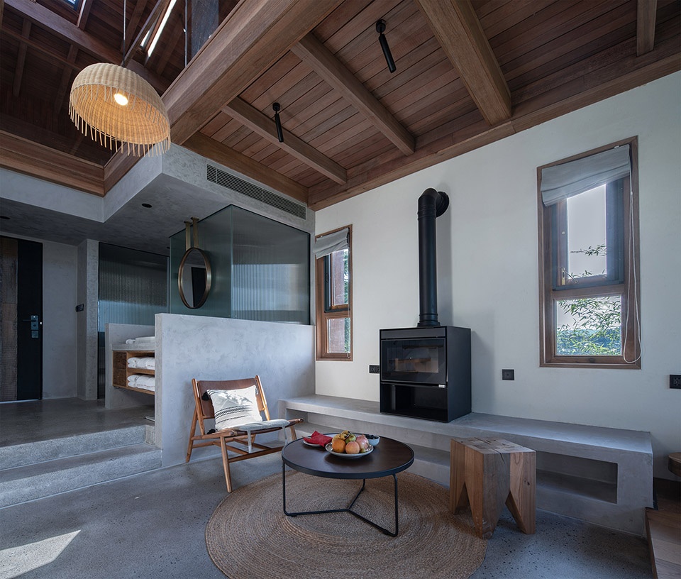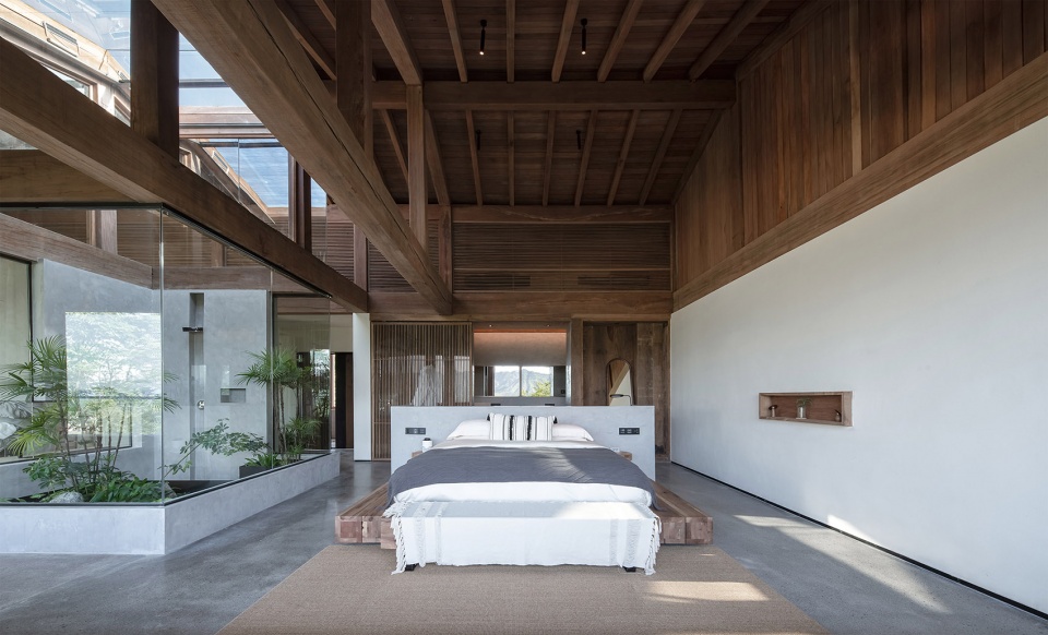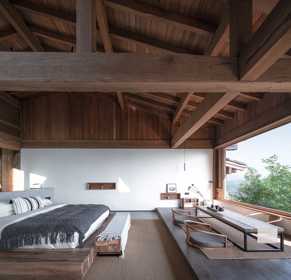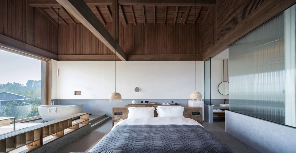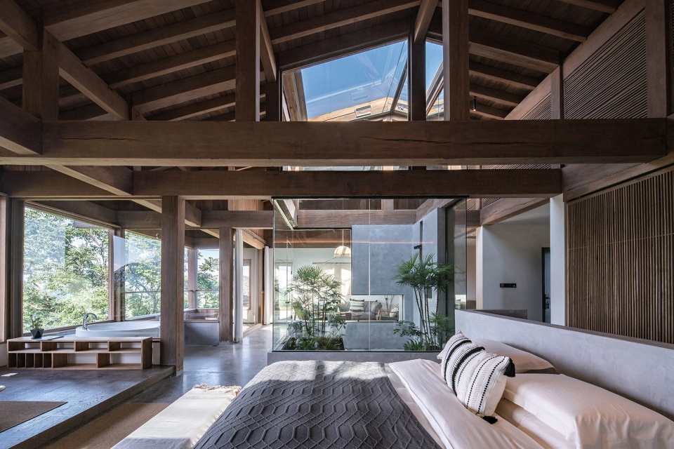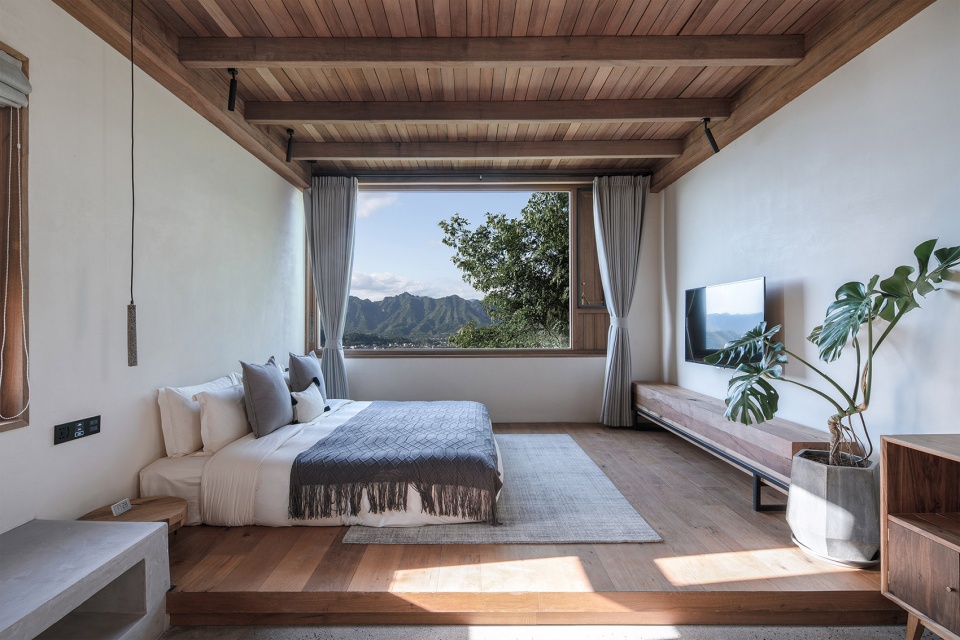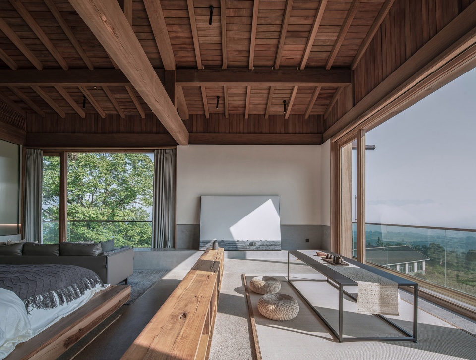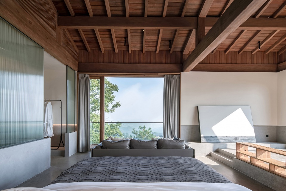 顶层是一个大套房,空间横向延展,从玄关转入便能看到连续的山景被引入室内,视野被完全打开,近处有部分树杈冒出,形成近景远景层次,坐在阳台,微风拂面,喝茶看山,非常舒适。套房的布局上以内天井和浴缸泡池为界分成两个区域,一半是睡觉喝茶区,一半是休闲水吧区,空间通透自由,屋顶木构梁架裸露,结构与空间的关系一目了然,清晨鸟叫声响起,打开窗帘便让人心旷神怡。