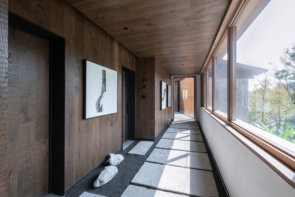 远山作为关键要素,在空间中希望被不同的方式观看感受:在建筑的下部分空间,山体是隐隐约约在树干间透出来,越往上行走,视野开阔的同时,连续的山屏也逐渐展现。同时通过客房的不同开窗方式,远山被引入的状态也不同,有长条卷轴式,有框景片段式,有连续断框画幅式,对不同的空间尺度和类型进行呼应。