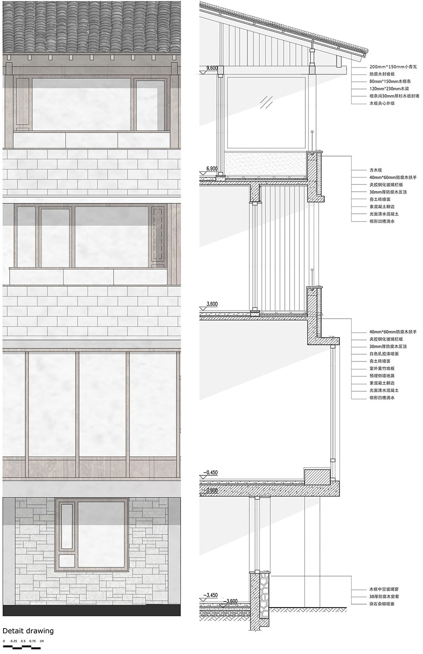 建筑的立面材料我们更希望能具有在地性,回到自然与建造的关系上, 充分的利用当地有的材料,既控制建造成本又能方便的找到当地工匠施工。像垒毛石,土砖墙,水洗石,水磨石,青砖墙,小青瓦,都是当地非常常见的用材,施工工艺简单,易取材,建造精确性易把握。