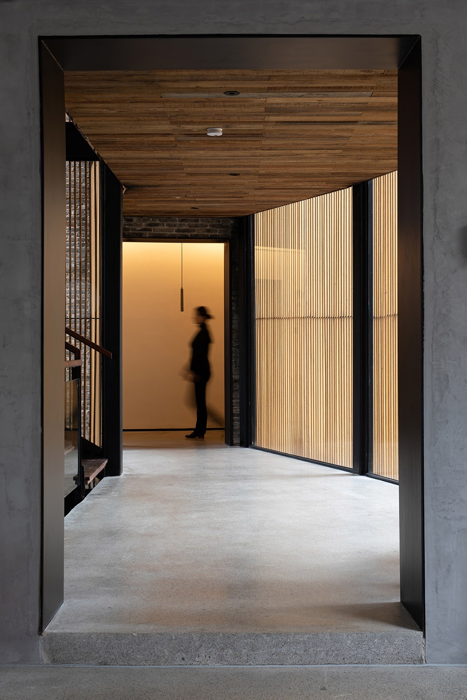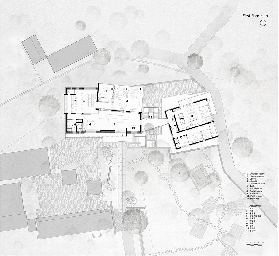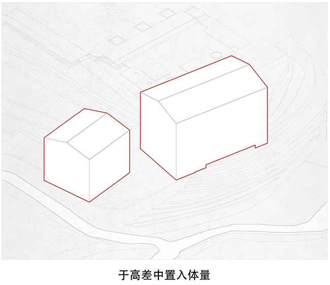 建筑用地是由三个宅基地组成,长条状地块,在东西方向上有将近3米的高差,两个宅基地位于西侧,一个宅基地位于东侧下端,刚好建筑就形成了两个主体量,一高一低,一大一小,中间用一部半通透的楼梯廊道链接两边。而场地又南高北低,利用原有场地的关系顺势挖了一部分地下空间,作为后勤储藏和设备用房,东侧的这部分高差则设计成一个开放的灰空间,为客人提供半室外的灵活空间使用。场地中的水系景观也顺着室外场地台阶逐级流下,形成多个小瀑布水口,构成流水声一直伴随着行走路径的体验。