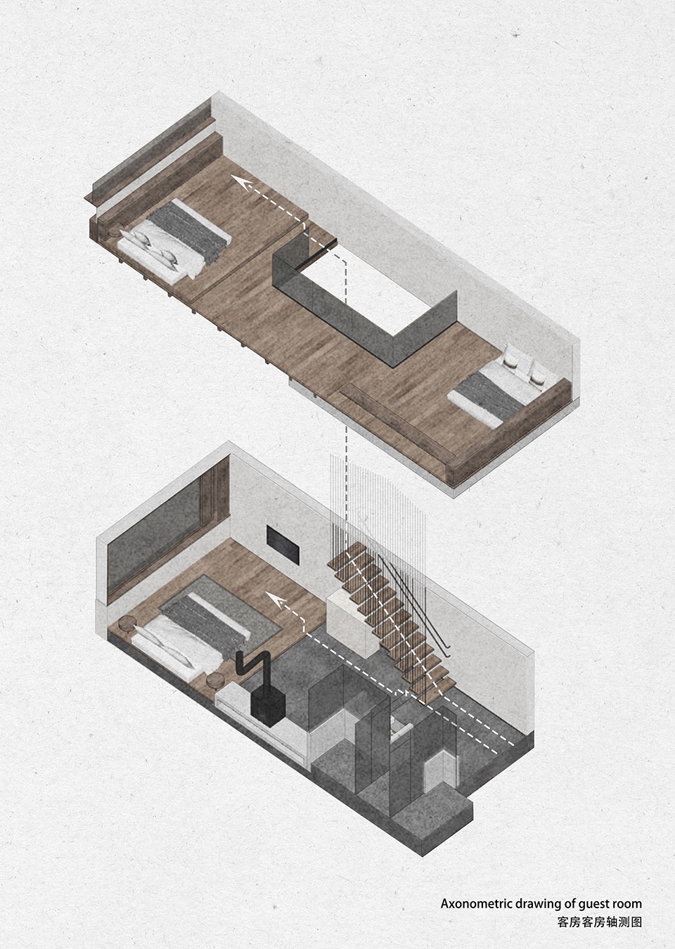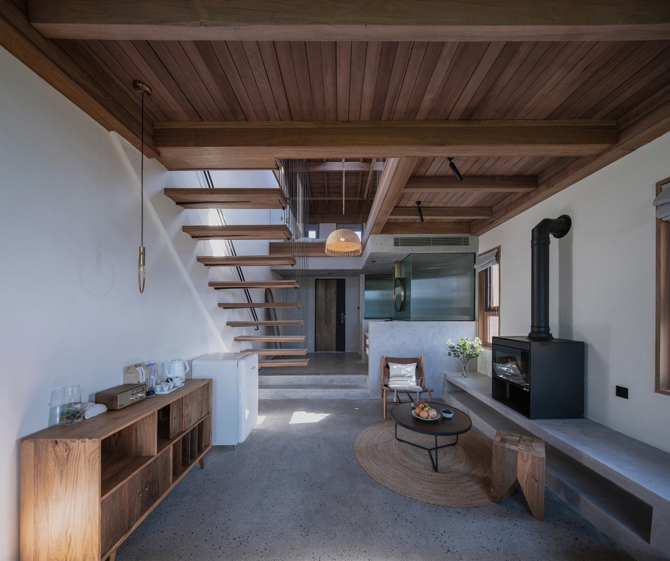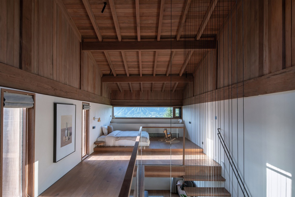 顺楼梯踏步而上,便到了二层的客房,亲子房体验令人惊喜:空间分上下两层,内部有楼梯上下,室内根据不同使用属性设置了不同的高差和地面材料,一层布置一个大床,二层南北两侧分别有两个大床,可以提供一家人居住体验,亲子客房二层直接是建筑的屋顶木结构层裸露,阁楼北侧开了一条窄长窗,把远处的山景框入窗内,形成横轴画卷。