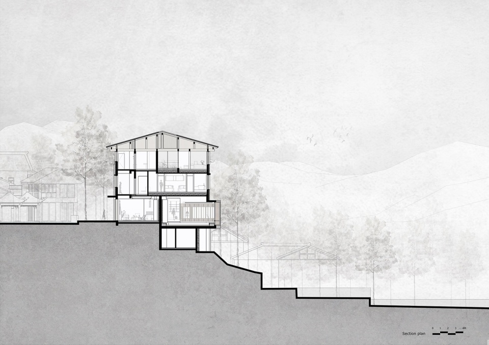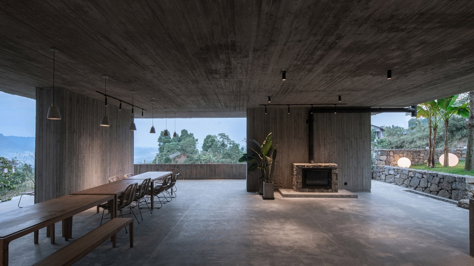 在结构的选择上,我们希望结构本身就是可以被表现的,是建筑空间和墙体体系的一部分,可直接被感知。用木模混凝土一次性浇筑,即是剪力墙结构,又是内外空间墙顶面,木纹和水泥质感即纯粹又能被直接触摸,而且可以实现无柱大开间空间,减少柱子的出现,实现空间自由。木构在当地传统建筑中被广泛使用,建筑的上半部分使用纯木构,与剪力墙结构体系咬合,木构杆件在室内空间中直接裸露,无二次装饰面层,结构材即空间面材,所有电线都走在屋顶保温层空腔里,极致的结合建筑结构和室内效果。