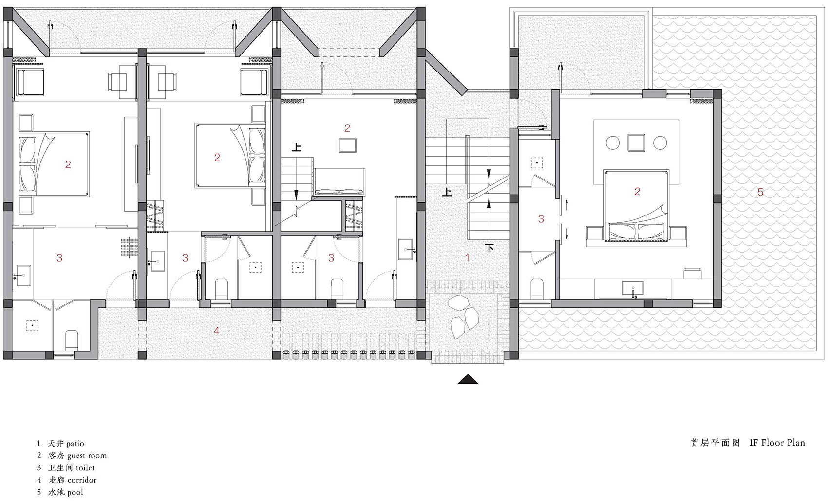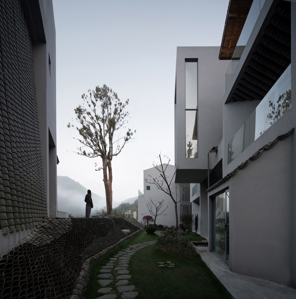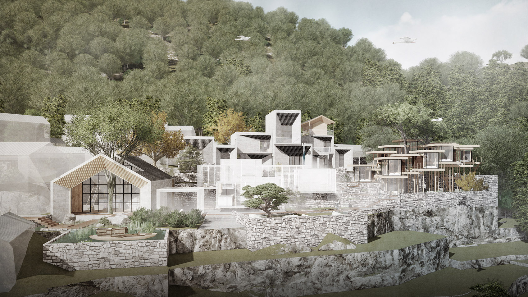 在实际民宿酒店项目的落地过程中,由具体的使用需求,场地中形成了三栋建筑单体,同时也是三个不同姿态的“山”。因场地红线的限制,呈三角形布局。前山平缓,横向舒展。后山高耸,扑面而来。侧山则卧于一侧。角落一圆形“月塘”,成为实际功能中的泳池。