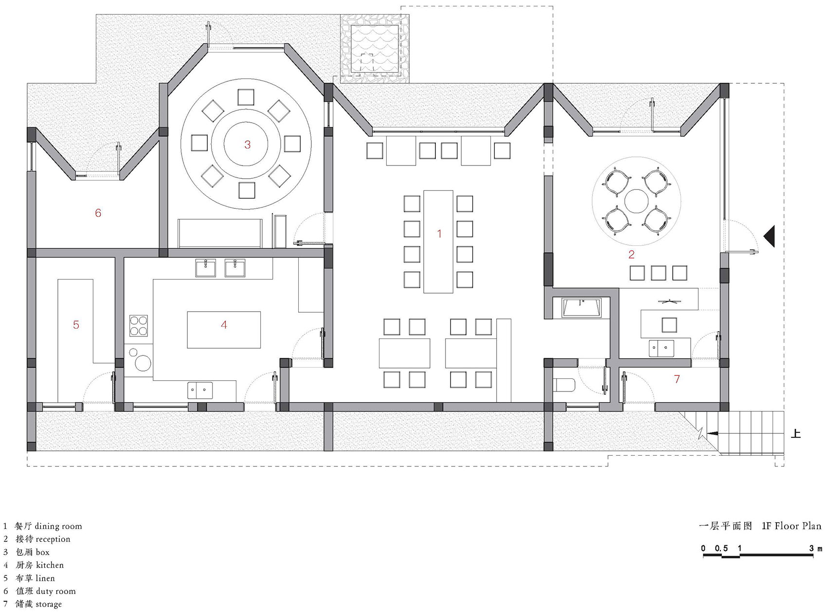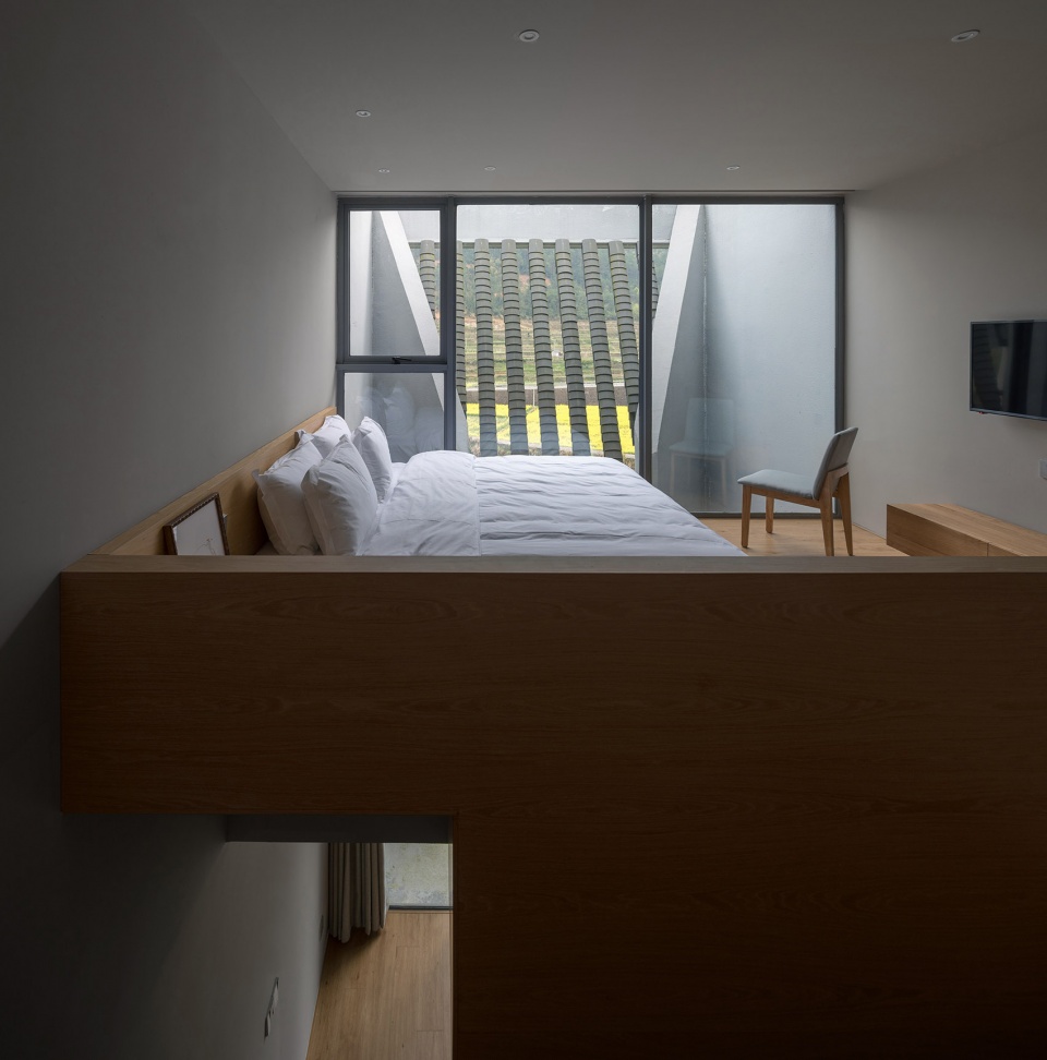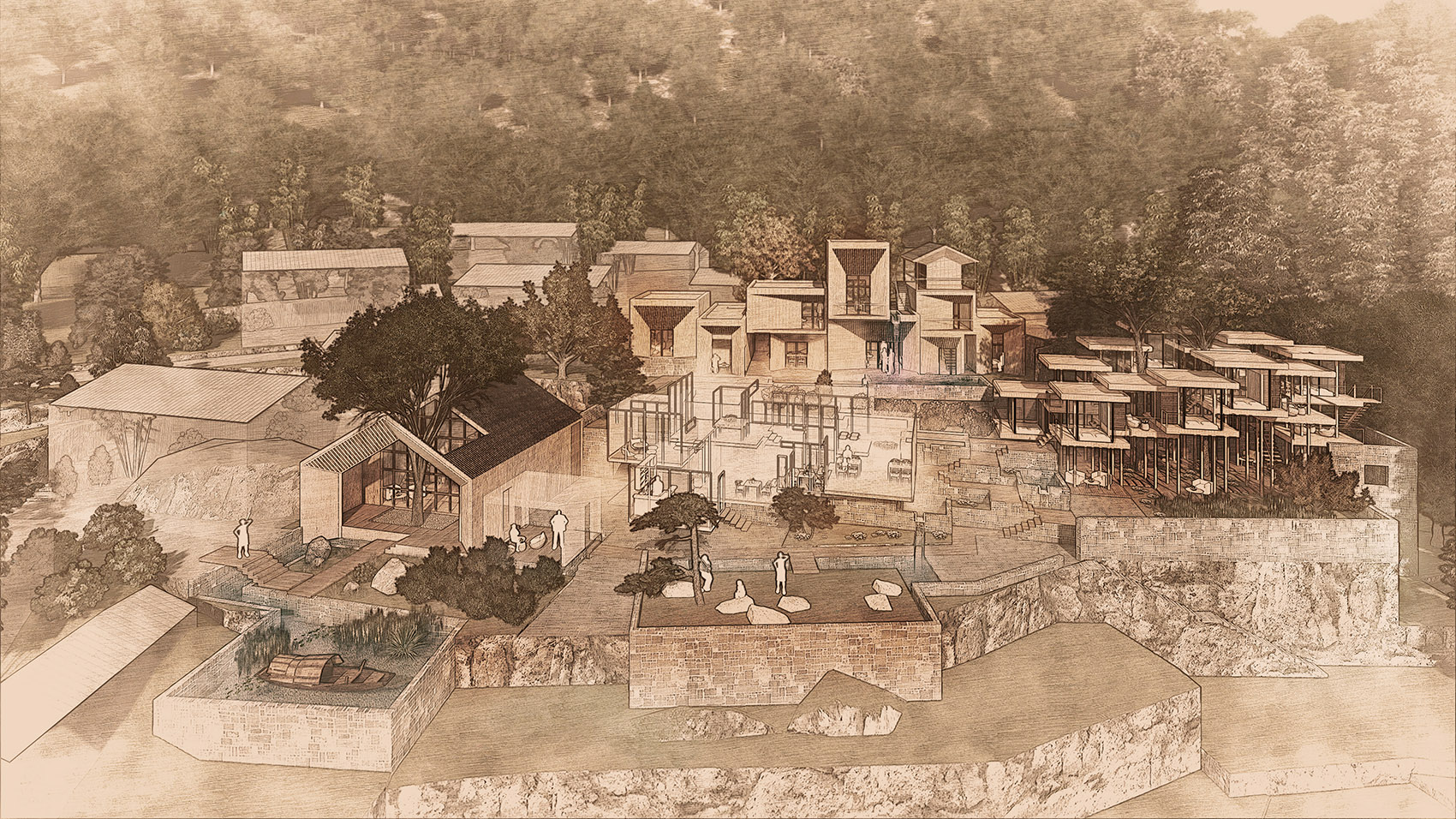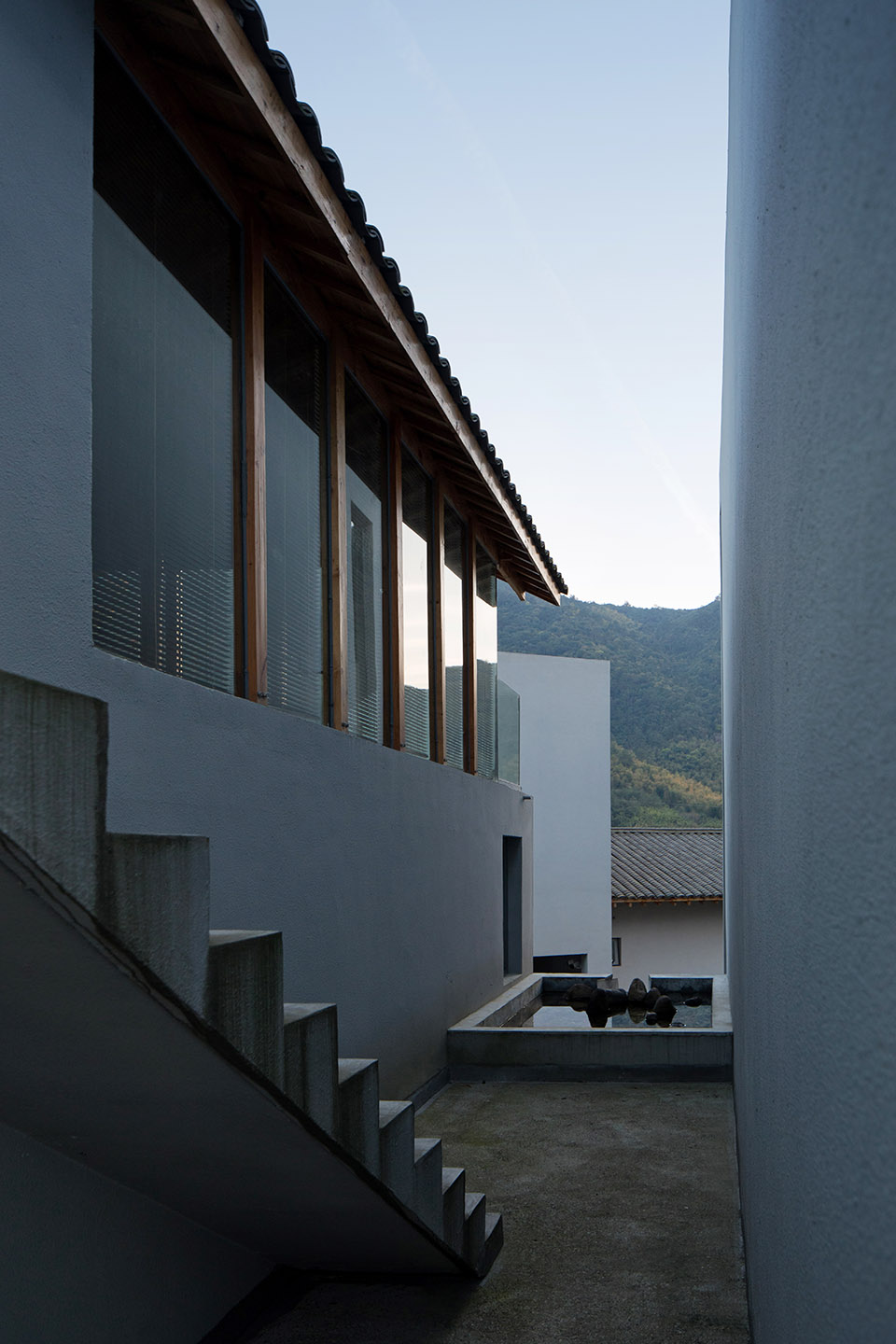 在实际民宿酒店项目的落地过程中,由具体的使用需求,场地中形成了三栋建筑单体,同时也是三个不同姿态的“山”。因场地红线的限制,呈三角形布局。前山平缓,横向舒展。后山高耸,扑面而来。侧山则卧于一侧。角落一圆形“月塘”,成为实际功能中的泳池。