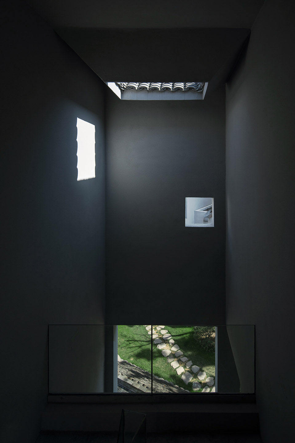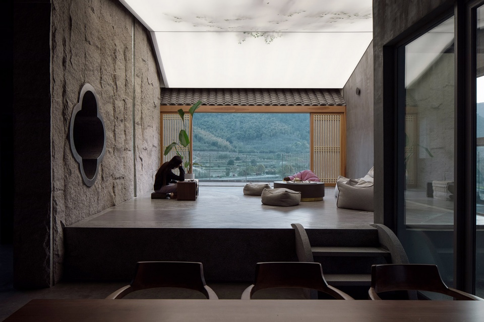 山可游而洞可居,山形构成之后,山之空处是安放身体的庇护空间。意为“居于洞穴”,洞穴之中,用瓦片来产生居所的暗示。为了让此意变得妙趣,在侧山的雅集之处将瓦片内外反置,将树影投于吊顶,产生一种内外置换的布景。恍惚中,内与外身不知何处。