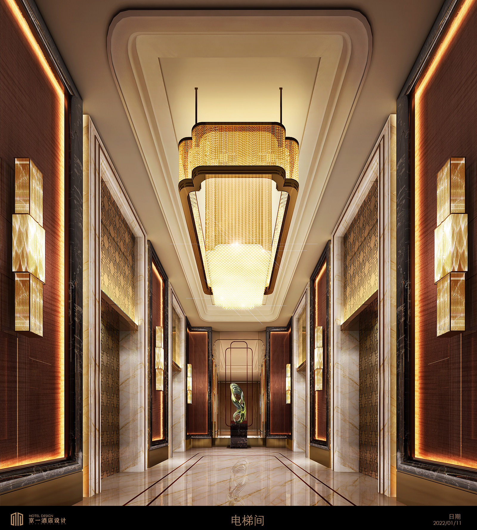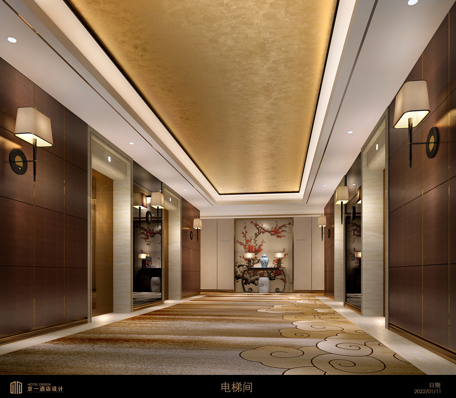 酒店电梯间包括天花设计,墙面设计,灯光设计以及地板设计,需要选材各种各样的设计风格,这里体现的是简洁,是中式风格电梯厅墙面采用红色的木饰面,高档的木材来做墙饰面的设计,并配...