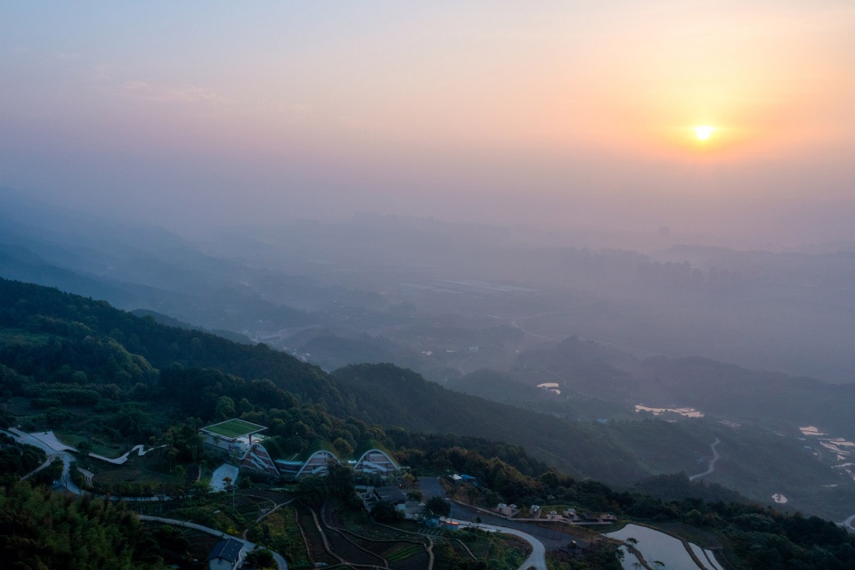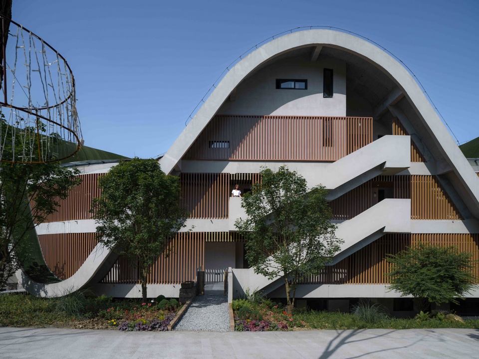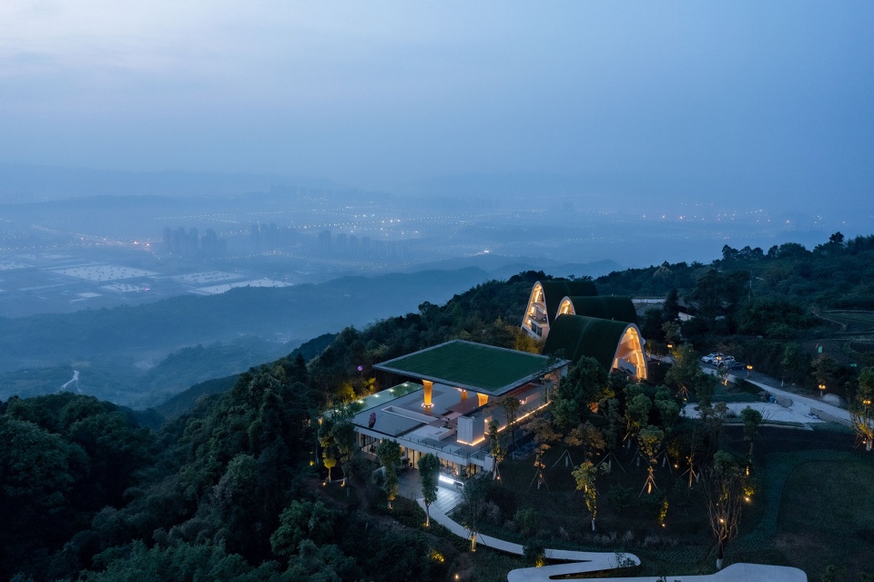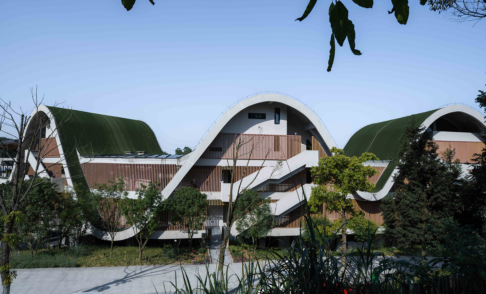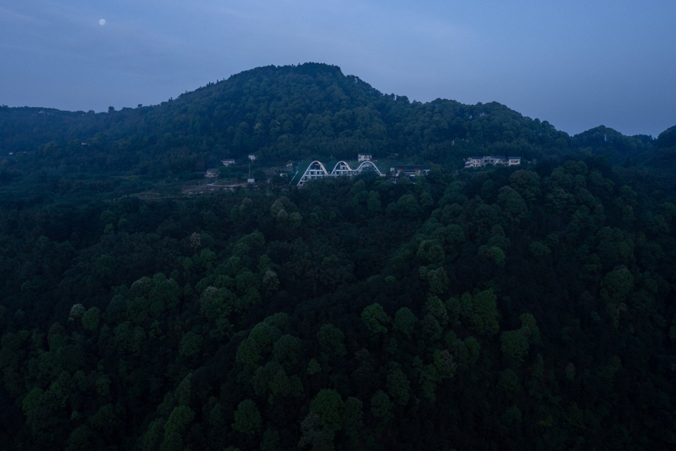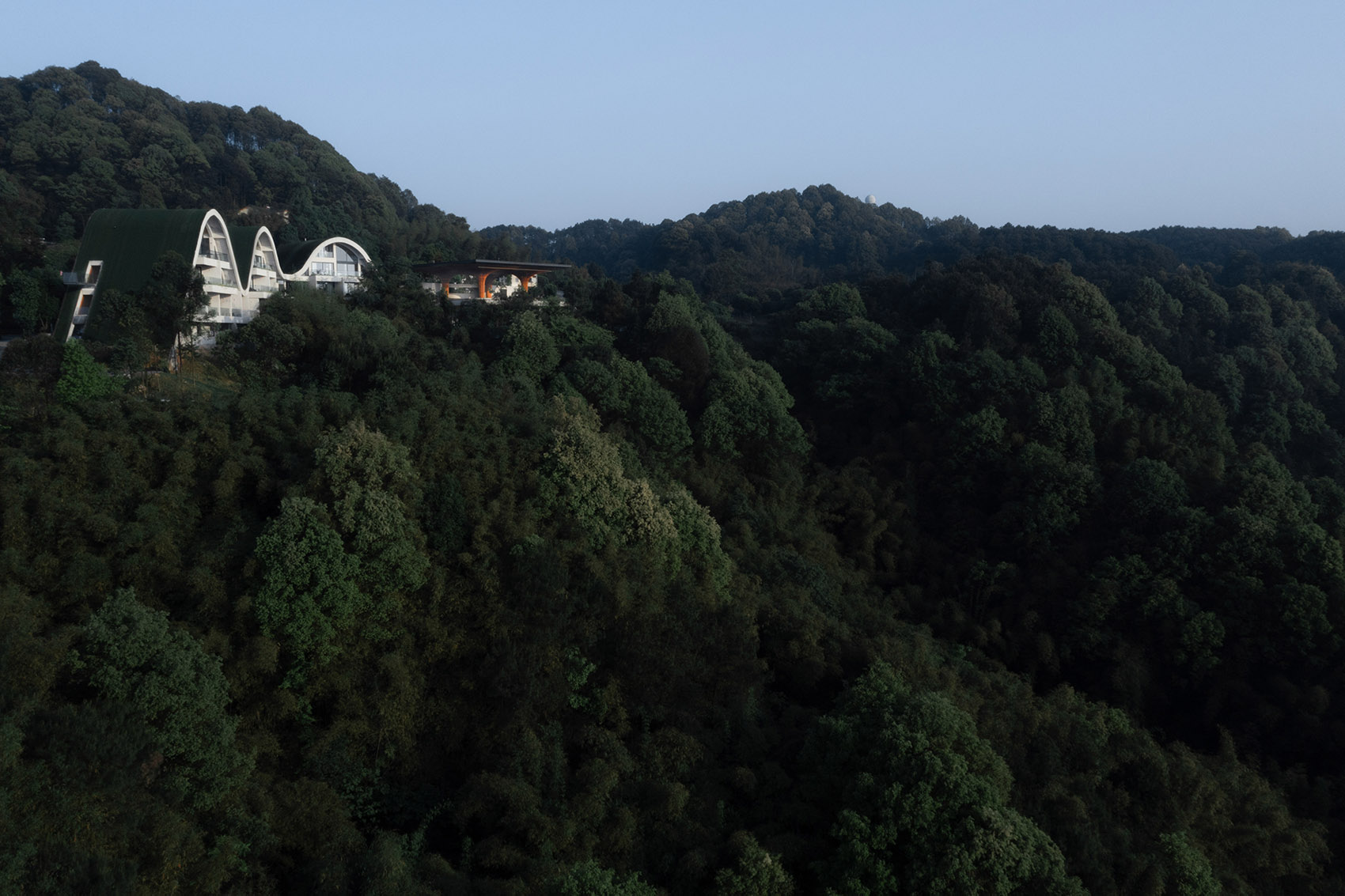 主体建筑以“麦田波浪”为设计意向,波浪型的建筑形态与玉峰山自然山地景观相映成趣,建筑成为自然场所的有机延伸,呼应着起伏的山势,表达着其与自然融合,亲近的态度。同时,起伏连续的弧形屋面将建筑体化解成了多个体块,消减了建筑庞大的体量感,有助于减少其对自然景观的尺度影响;建筑的弧形屋顶亦产生了建筑内部空间的多样变化,使得客房空间产生了新的“机会”,尤其是顶层的“拱顶”客房结合建筑造型而设计,创造了独特的度假体验感。