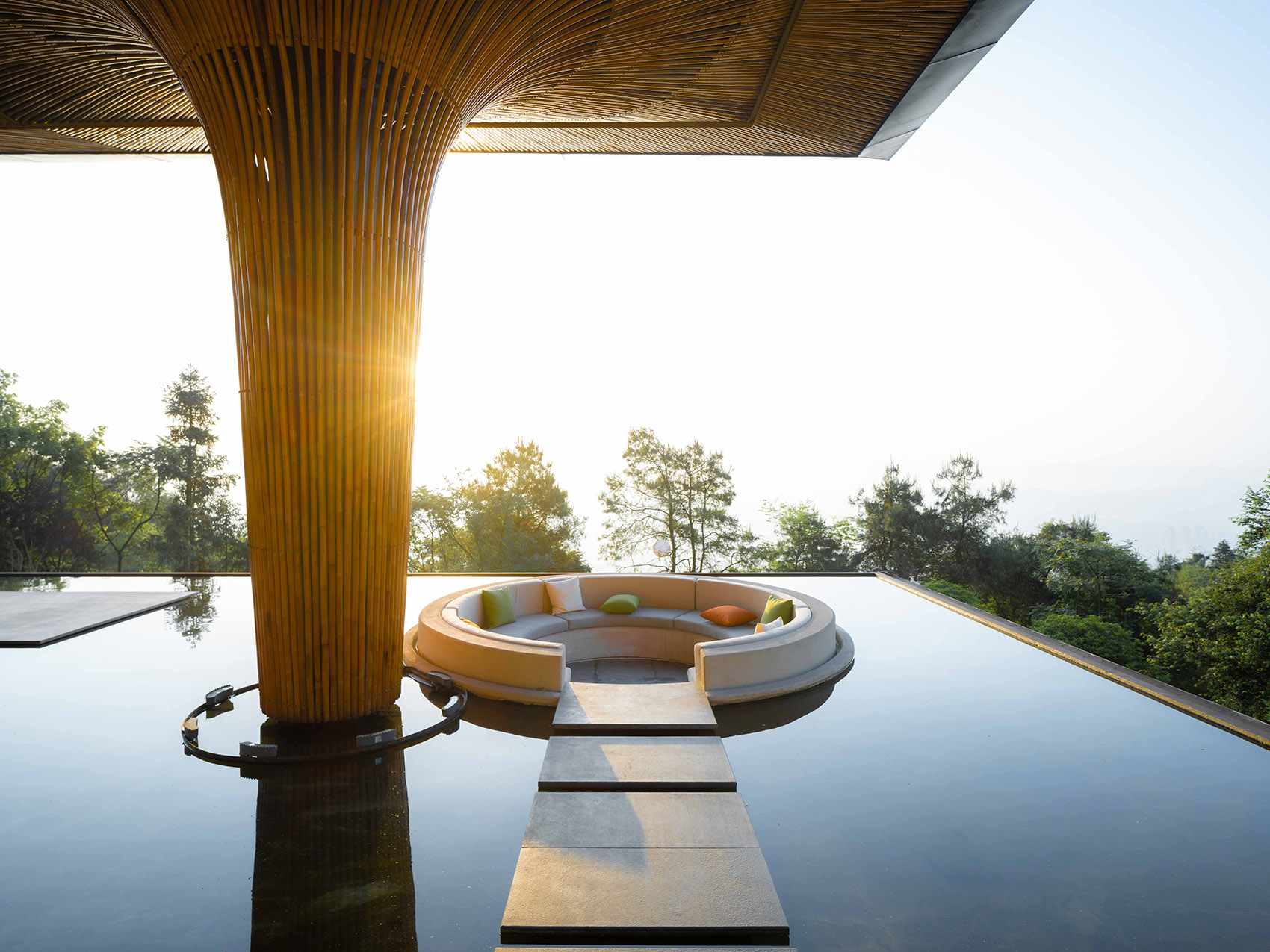 客人在进入园区的时候,所见的并非建筑的全貌,而只是“若隐若现”于山头、树林之后的公共区域,呈现的是一种“藏”的状态,沿着蜿蜒曲折的入口坡道徐徐下行进入一层的大堂空间,四周的玻璃界面让人们能够充分欣赏山间美景,室内与景观、建筑互相渗透融合,流动转化。离开一层大堂空间,客人顺着楼梯拾级而上,进入二层的公区架空平台:映入眼帘的是安静的水面与四把“竹伞”共同形成的的灰空间,对称的“竹伞”与镜面水如同“画框”般将山林美景框定,这里是富有禅意的宁静空间,是众人照相打卡必到之处,同时也因为其空间的“仪式感”,为酒店经营提供了户外婚礼场所的可能。