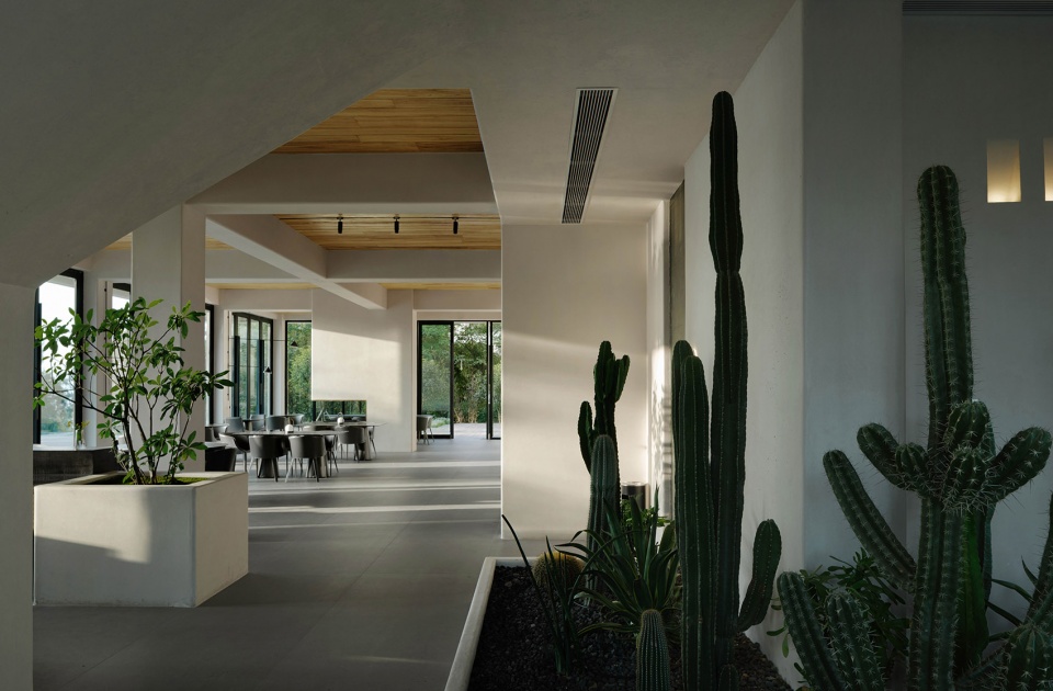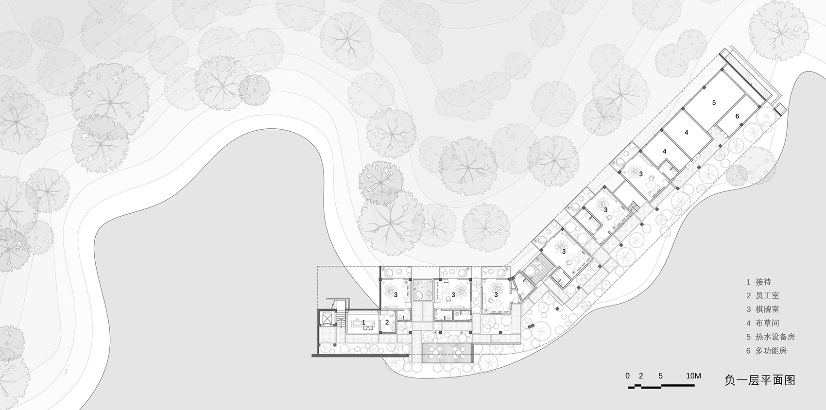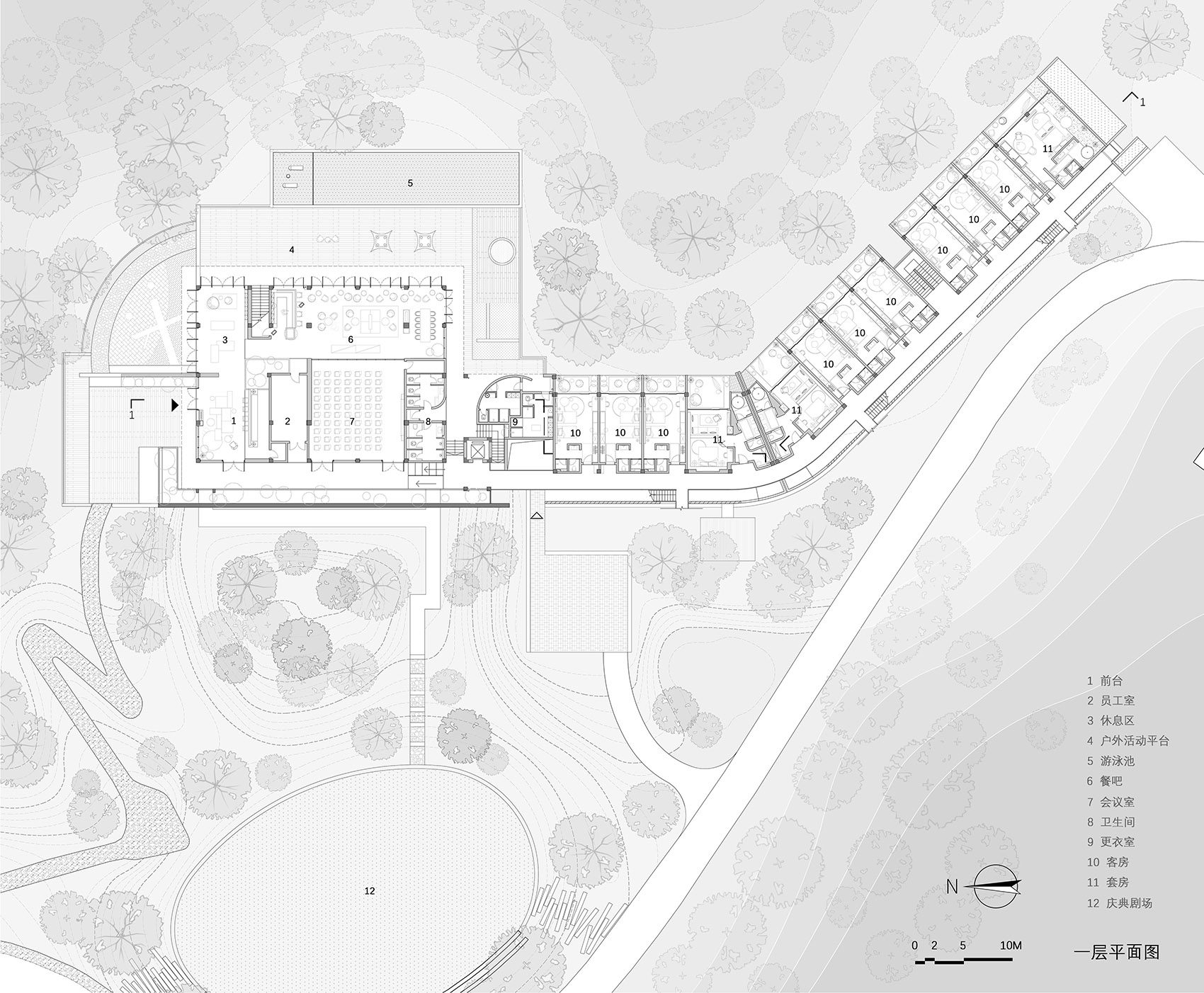 在建筑的竖向空间的设计上,结合坡地地形设计吊一层架空层空间,作为娱乐用房、设备房、布草间等功能区,而对于这部分功能空间的利用建筑师是克制的,避免过多对地形的破坏。通过建筑空间的填充,化解主体与山地之间的高差,让建筑锚固于复杂的场地地形之中。